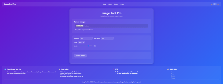 In the age of digital media, managing large batches of images efficiently is crucial — whether you’re a web designer, content creator, or just organizing your photo library. Our Batch Image Resizer, Converter, and Compression Tool brings the perfect blend of functionality and sleek design to your browser. And the best part? It’s fast, responsive, and free to use!