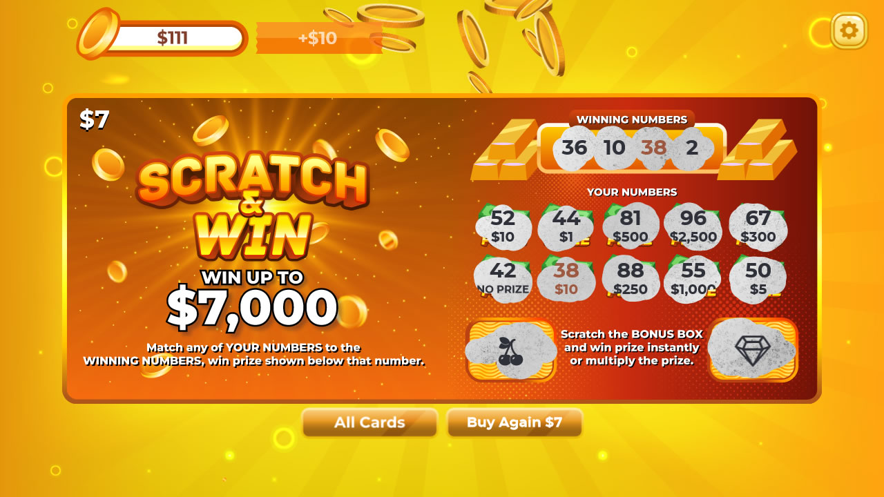 Scratch & Win is a HTML5 game where user given a card which can be revealed by scratching off an opaque covering, select up to 5 different scratch cards including bonus, match 3, winning numbers, every scratch card give chance to win prizes.